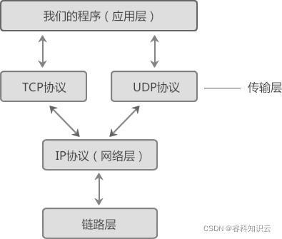 本教程所讲的 socket 编程是基于 TCP 和 UDP 协议的,它们的层级关系如下图所示: