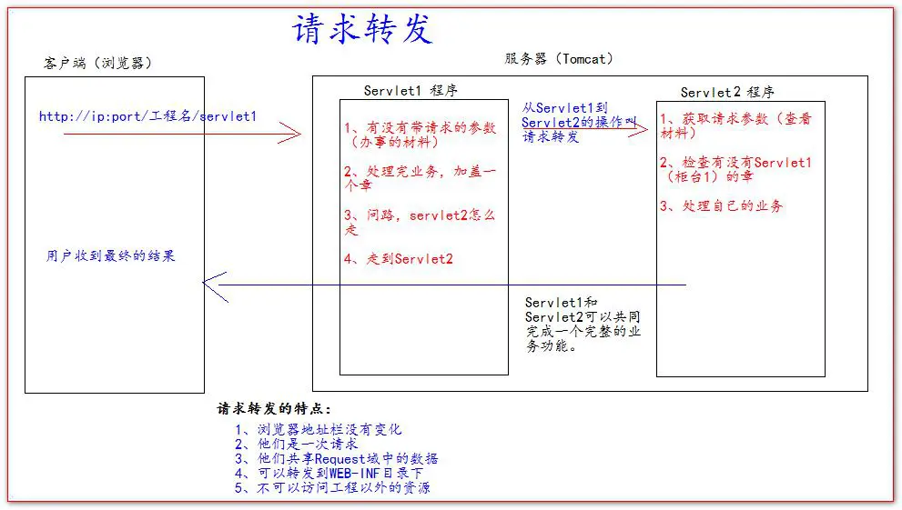 请求转发是指,服务器收到请求后,从一次资源跳转到另一个资源的操作叫请求转发。