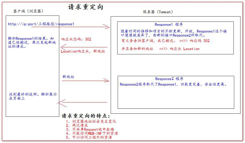请求重定向,是指客户端给服务器发请求,然后服务器告诉客户端说。我给你一些地址。你去新地址访问。叫请求重定向(因为之前的地址可能已经被废弃)。