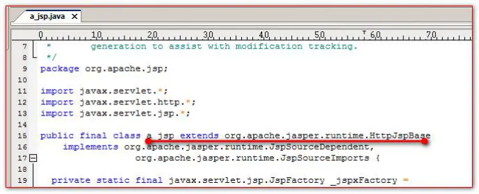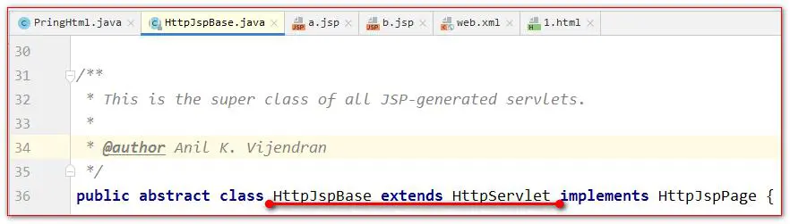 我们跟踪原代码发现,HttpJspBase 类。它直接地继承了 HttpServlet 类。也就是说。jsp 翻译出来的 java 类,它间接了继承了 HttpServlet 类。也就是说,翻译出来的是一个 Servlet 程序