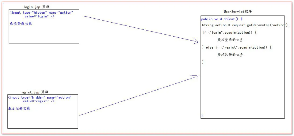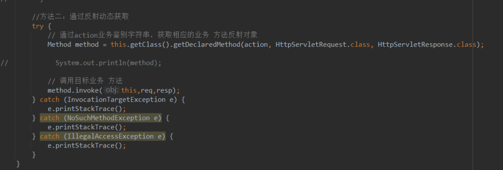 Method method = this.getClass().getDeclaredMethod(action, HttpServletRequest.class, HttpServletResponse.class);