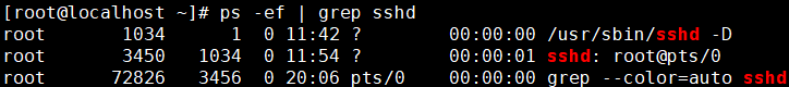 root 72826 3456 0 20:06 pts/0 00:00:00 grep –color=auto sshd