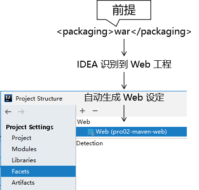 然后到 Facets 下查看 IDEA 是否已经帮我们自动生成了 Web 设定。正常来说只要我们确实设置了打包方式为 war,那么 IDEA 2019 版就会自动生成 Web 设定。