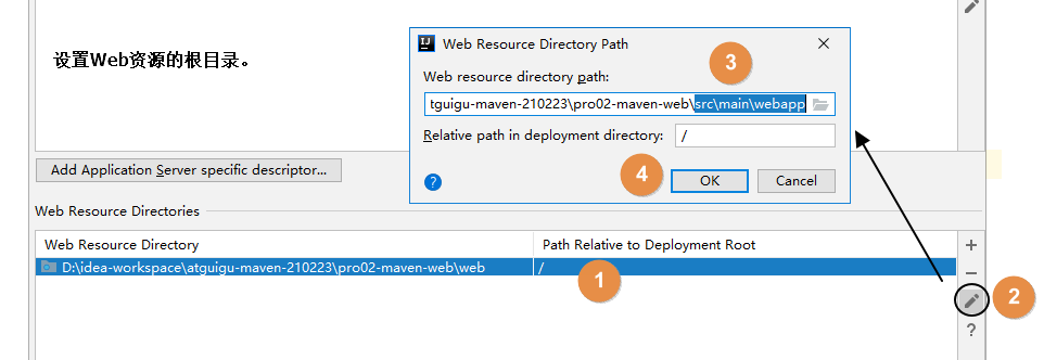 结合 Maven 的目录结构,Web 资源的根目录需要设置为 src/main/webapp 目录。