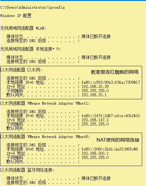 从下图中,我们看到的是Windows系统中的网络连接。其中VMnet8就是NAT模式所需要使用的网络连接。我们必须保证VMnet8的IP地址的网段必须和Linux系统中IP地址的网段一致。