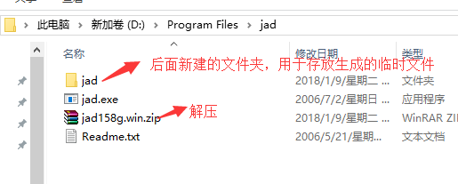 5、新建一个文件夹,将jad的压缩包拷贝进去并解压,其中jad是第7步建的,也可以建在其它任意磁盘里面