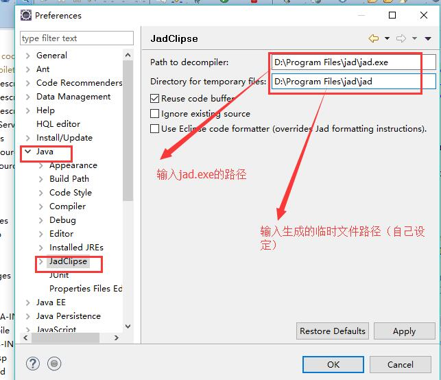 6、设置jad的可执行文件路径以及生成的临时文件路径,如图所示
