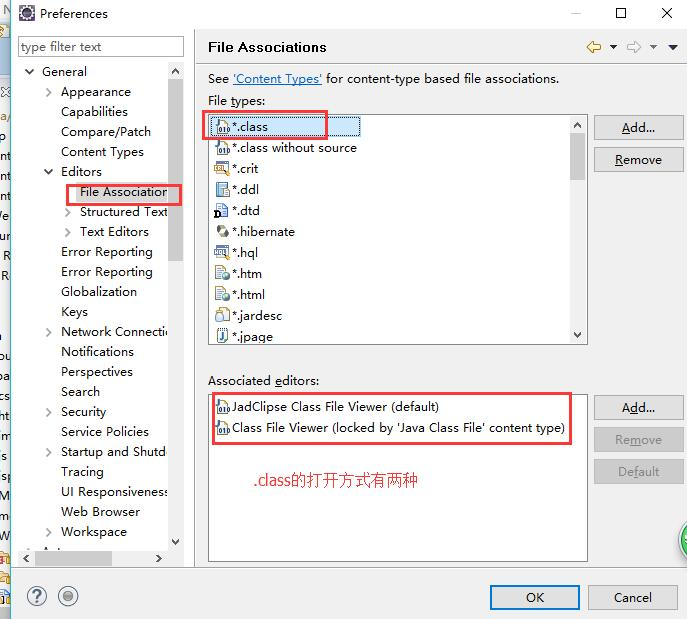 基本配置完毕后,我们可以查看一下class文件的默认打开方式,Eclipse->Window->Preferences->General->Editors->File Associations,我们可以看到下图: