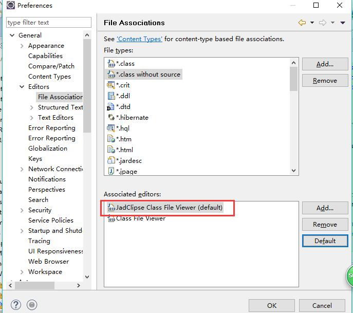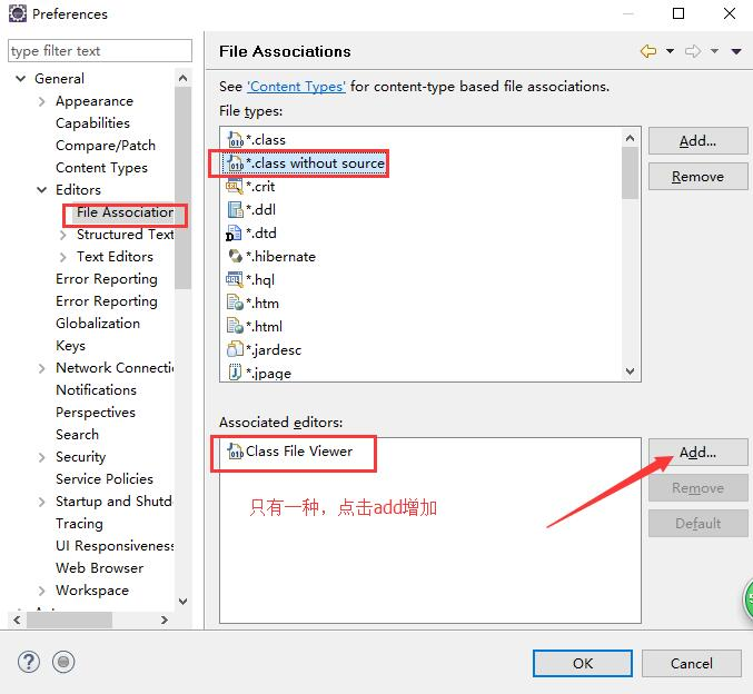 可以看到*class文件的打开方式有两个,JadClipse和Eclipse自带的Class File Viewer,而JadClipse是默认的;另外*.class without source可能只有一个Class File Viewer,需点击右边的Add按钮,增加JadClipse Class File(default)方式,且需要设置为defalut方式。