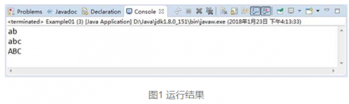 文件1中,分别使用表1中的3个构造方法创建了字符串对象。其中第4行代码使用无参构造方法创建的是一个空字符串,所以第一个输出语句中的str1为空(””),当使用连字符(+)连接a和b后,输出的结果为ab。第6行代码使用参数类型为String的构造方法创建了一个内容为abc的字符串,第8~9行代码使用参数类型为字符数组的构造方法创建了一个内容为字符数组的字符串。从图1可以看出,它们最后的输出结果就是存储在字符串对象中的内容。