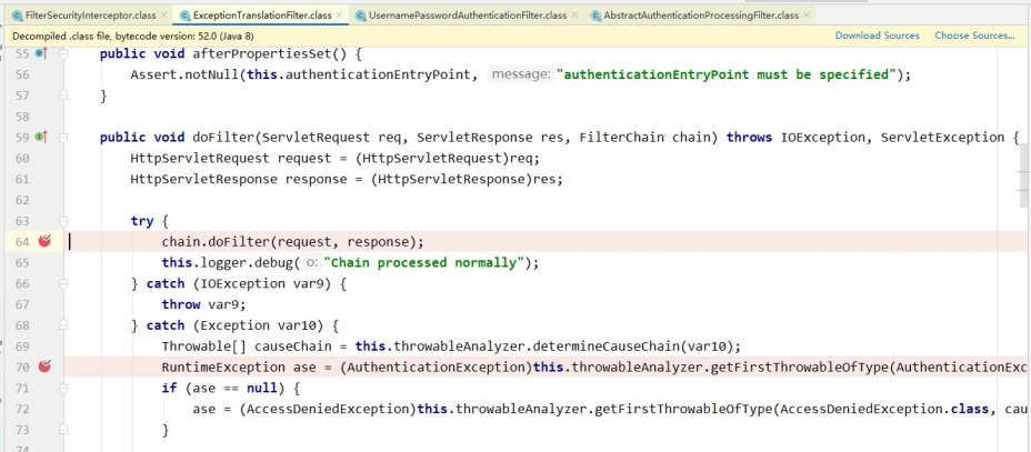 ExceptionTranslationFilter:是个异常过滤器,用来处理在认证授权过程中抛出的异常