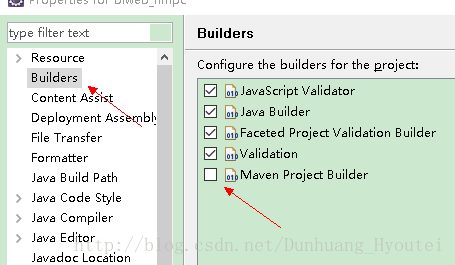 在项目右键点击–>Properties(选中项目快捷键Alt+Enter)–>Builder–>Maven Project Builder取消勾选就可以了,其他保持不变。
