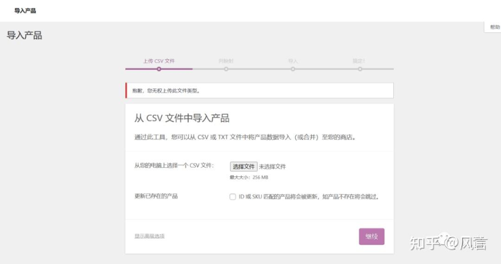 我在导入Woocommerce产品CSV文件时,就出现了提示“抱歉,您无权上传此文件类型。”的错误。如下图: