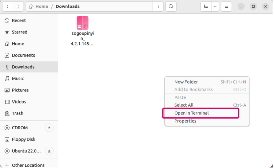 4,进入搜狗输入法存放目录,随用用终端打开这个目录,然后执行安装搜狗输入法