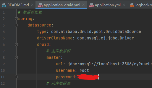 编辑src/main/ resources目录下的application-druid.yml 文件,修改数据库地址账号信息。