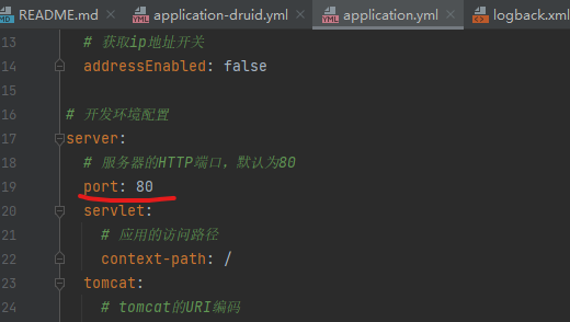 编辑src/main/ resources目录下的application.yml 文件,默认端口为80