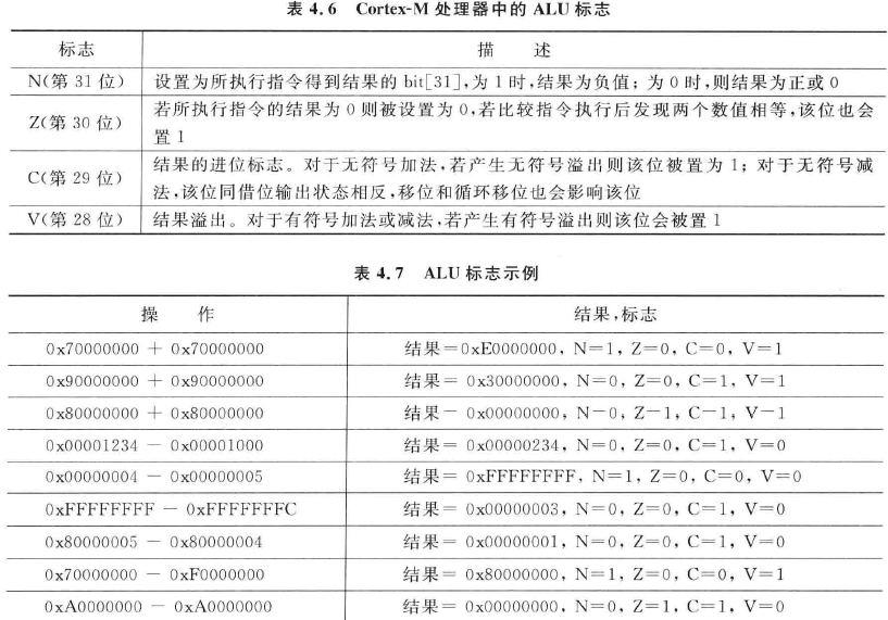 在加/减法运算指令中,当操作数与运算结果为二进制的补码表示的带符号数时,V = 1表示符号位溢出。如:两个正数执行ADDS指令后,和运算结果的MSB为1(视为负数),则发生溢出。